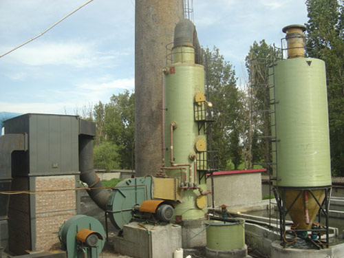 烟气从塔底部切线方向进入玻璃钢净化塔除尘器主体, 自下而上与吸收液逆流接触。烟气在旋流板上旋激液体,把液体分散成较小的液滴,增大了传质效果。气相和液相在接触过程中, 气相中的烟尘和二氧化硫在扩散、碰撞的作用下被捕获截留和吸收。液滴和颗粒物又在离心力的作用下,甩向四周的薄液流边界层而被除去。该装置具有开孔率大、负荷高、压降低、处理能力大、操作弹性大、不易堵塞等优点。